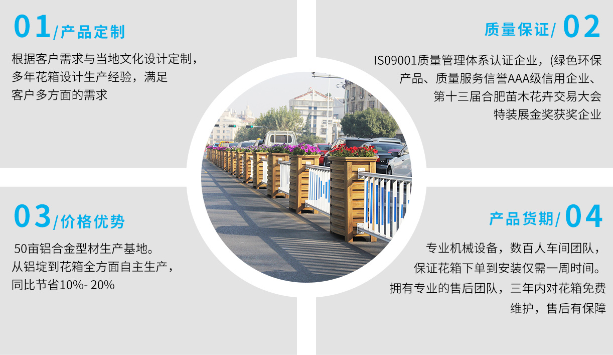 •       上海曦信環(huán)保科技股份有限公司成立于2013年,是一家專業(yè)的馬路花箱供應(yīng)商。本公司自成立以來,經(jīng)歷了奠定基礎(chǔ),穩(wěn)步發(fā)展的過程。品牌已形成市場(chǎng)優(yōu)勢(shì),現(xiàn)正處于乘勢(shì)而上發(fā)展壯大的階段。創(chuàng)立先進(jìn)的經(jīng)營理念和企業(yè)文化,生產(chǎn)經(jīng)營規(guī)模不斷發(fā)展壯大。公司主要從事馬路花箱,花箱護(hù)欄,木紋鋁合金花箱,座椅花箱,鋁板花箱、不銹鋼花箱、鋁合金護(hù)欄、鋁合金葡萄架,公園座椅,戶外果皮箱垃圾桶、鋁合金葡萄架等金屬建材產(chǎn)品的生產(chǎn)和銷售...
